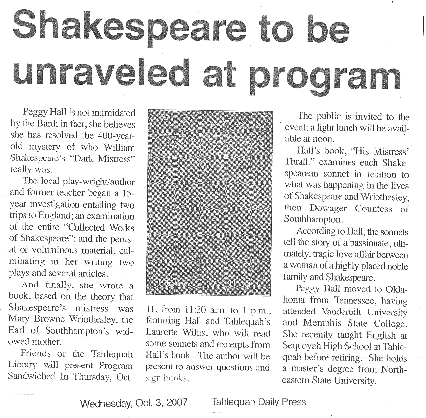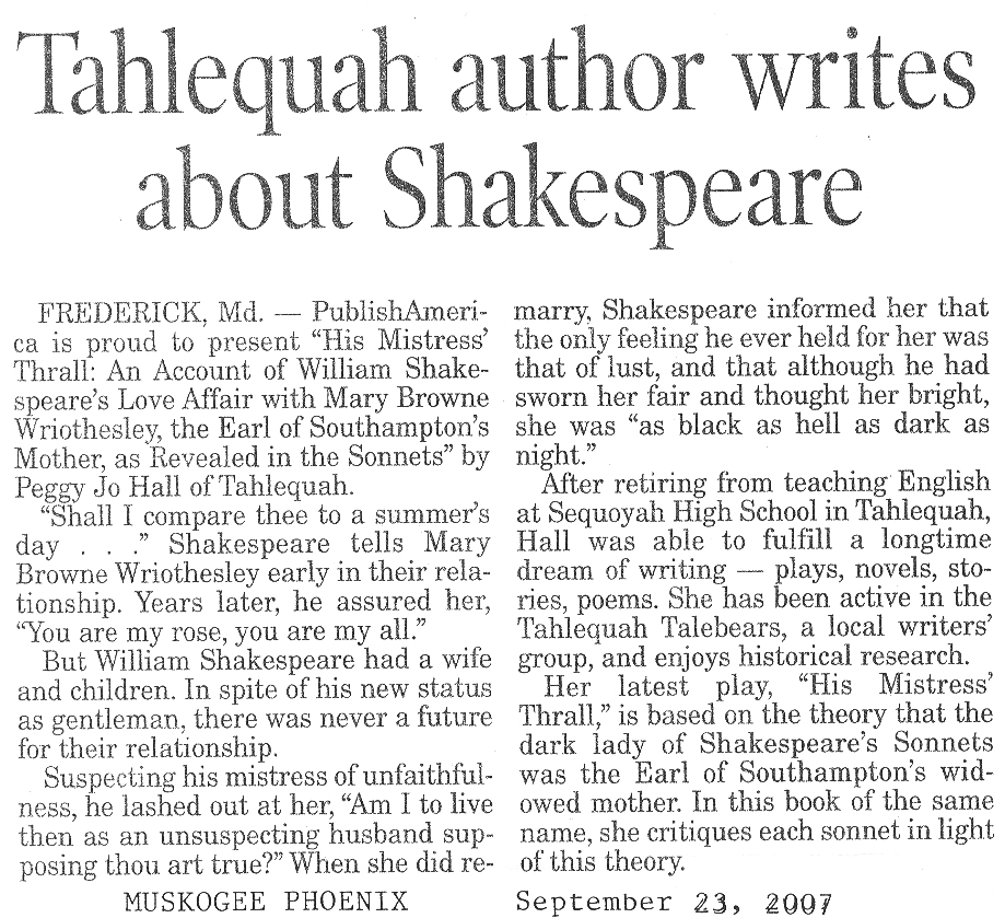 Hall, Peggy Jo - His Mistress' Thrall: An Account of William Shakespeare’s Love Affair with Mary Browne Wriothesley, the Earl of Southampton’s Mother, as Revealed in the Sonnets